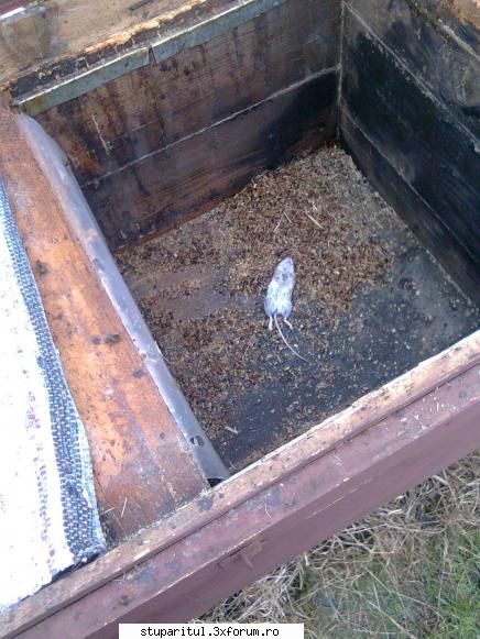 In data de 11 ian la la introdus apifonda am stricat un cuib de soricel cu 5 pui ce ierna intr-un orizontal ; pus gratie toate bune. Ieri la stramtorarea cuibului acelasi stup acelasi culcusi dar fara pui rosese intre gratie si urdinis intrase si a mancat numai pastura 4 rame varza;chestia dulce e ca nu s-a atins de miere.L-m stramtorat la ,,sange'' am peticit cu o tablita locul de intrare facut de,, musteriu''asigurat gratia toate bune. Nu am ajuns bine acasa ca am si primit telefonde la soacramea; ,,mama soricelul e pe scandura de zbor si roade la urdinis ce sa-i fac''?? Asta va intreb si eu; ce sa fac???